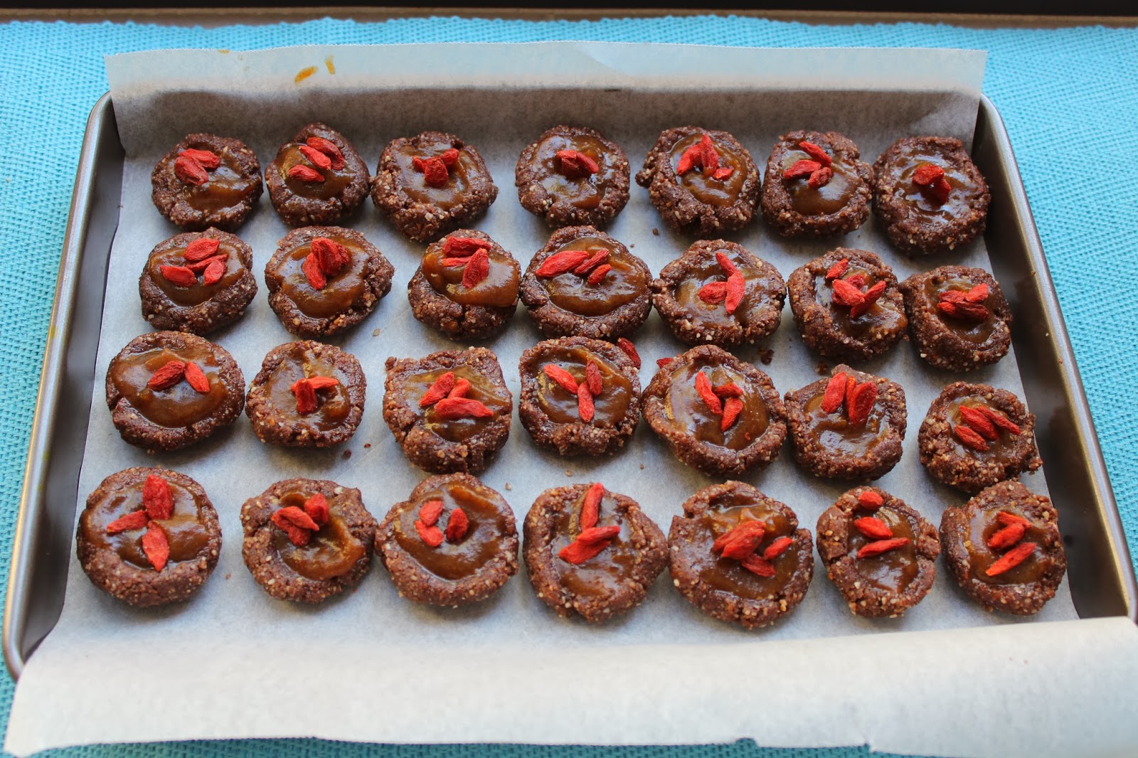 I topped the raw treats with Goji berries but you could also use nuts or a layer of raw chocolate. I might try the latest next time...